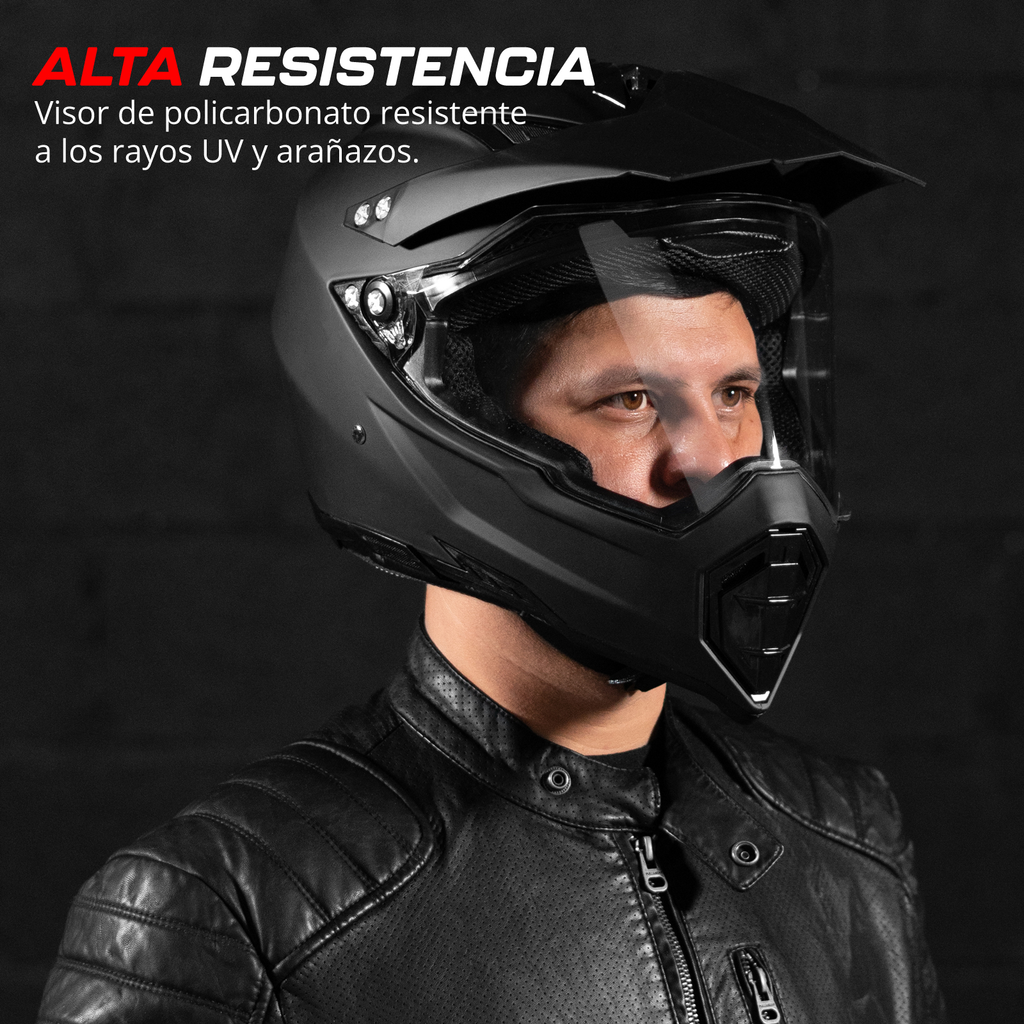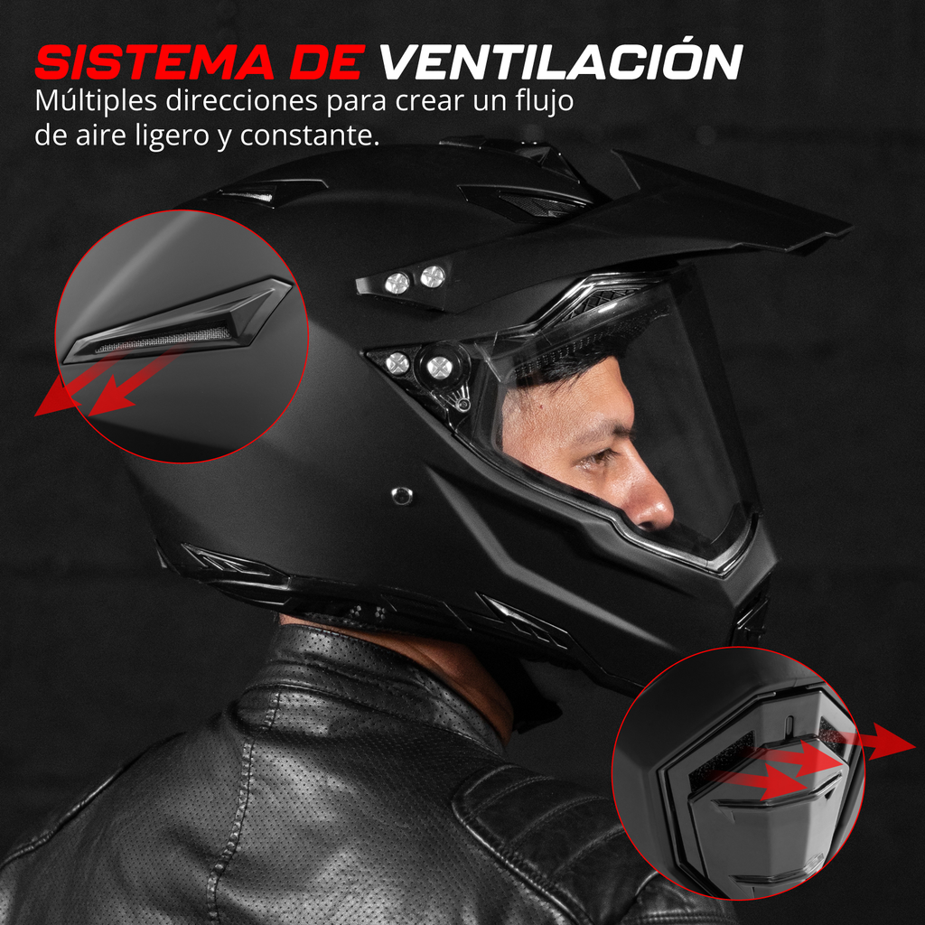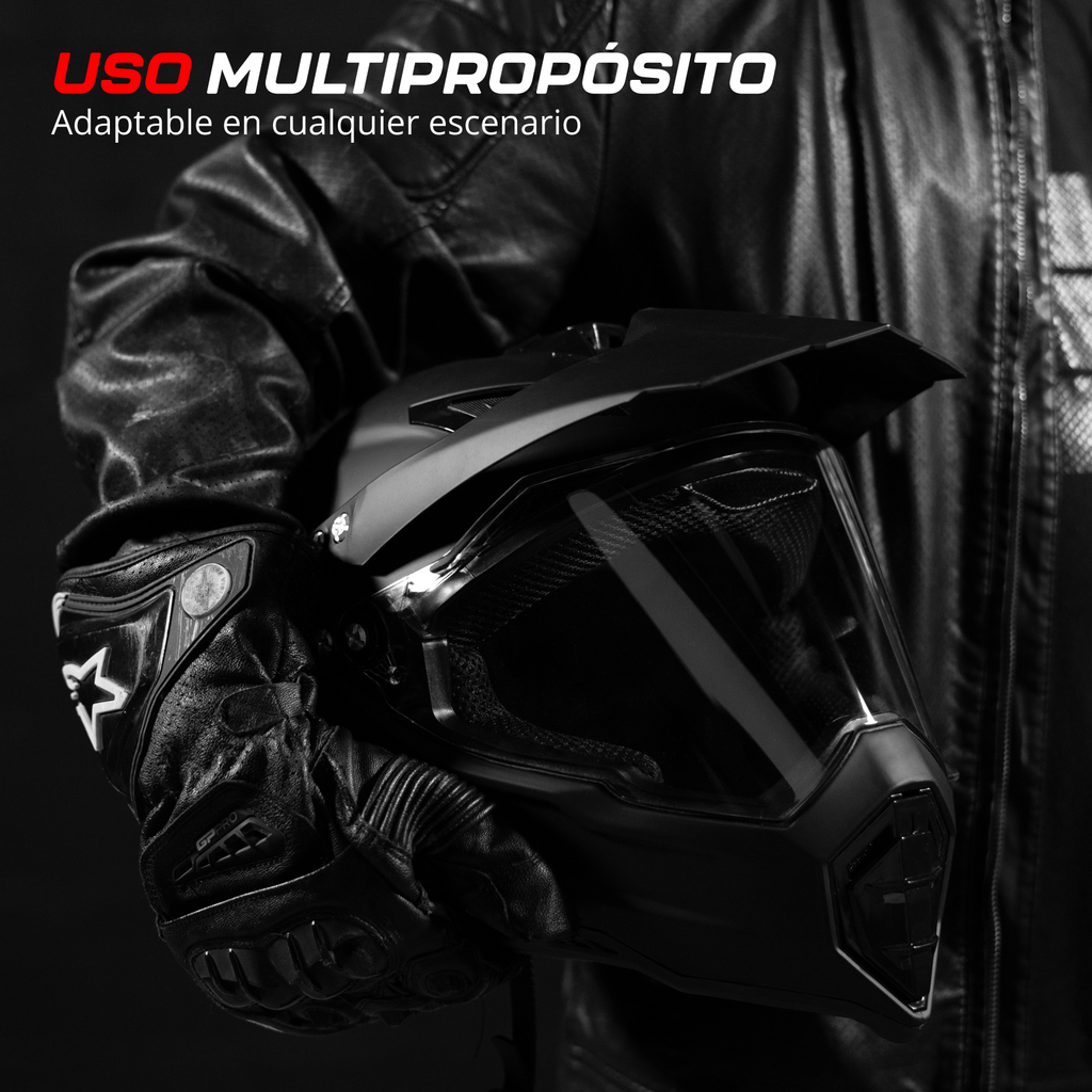 CASCO MULTIPROPOSITO. Se adapta a cualquier escenario: para recorrer la ciudad, largos trayectos en asfalto, o fuera de la carretera. Úsalo con o sin visera, además puedes extraer el visor para usar en su lugar unas gafas off-road.