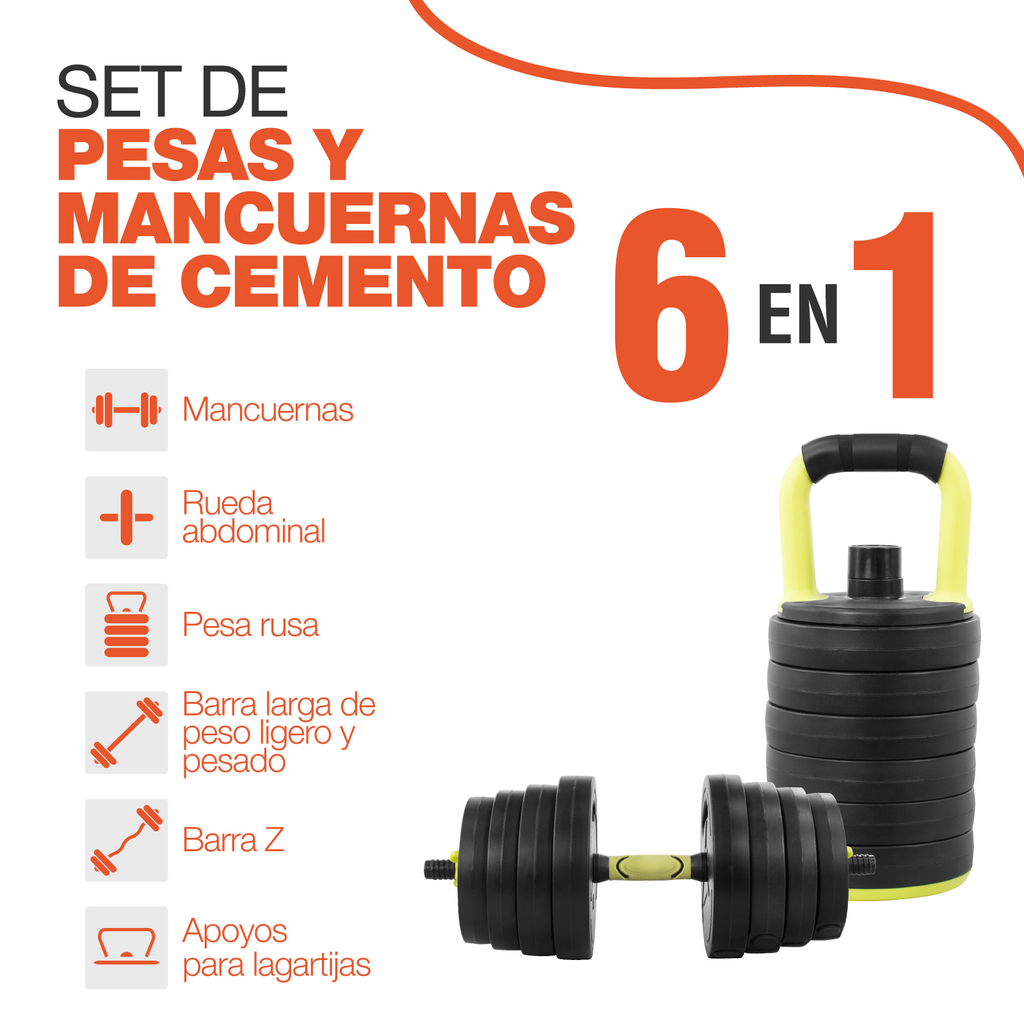 SET 6 EN 1. Cuenta con dos barras conectoras para convertir el par de mancuernas en una pesa de barra recta y de barra zeta, cuenta con un rodillo para armar una rueda abdominal, además de un adaptador para pesa rusa que a su vez puede usarse como apoyo para...